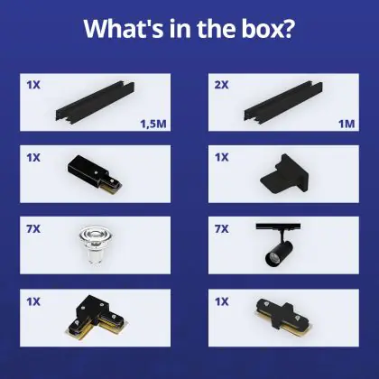 Beschrijving Complete Set 1-Fase Rail L 1,5 x 2 Meter Zwart | incl. 7x Spot + GU10 2700K 3W Dimbaar + Eindkap, Voedingsconnector en L -Verbindingsstuk